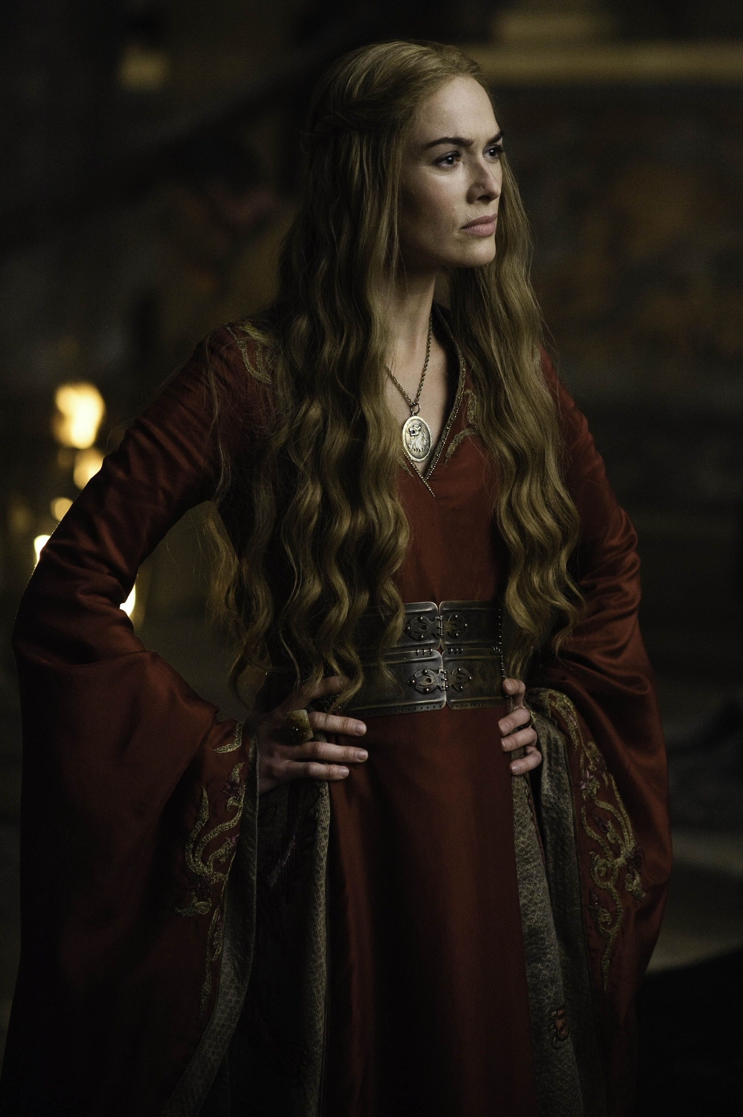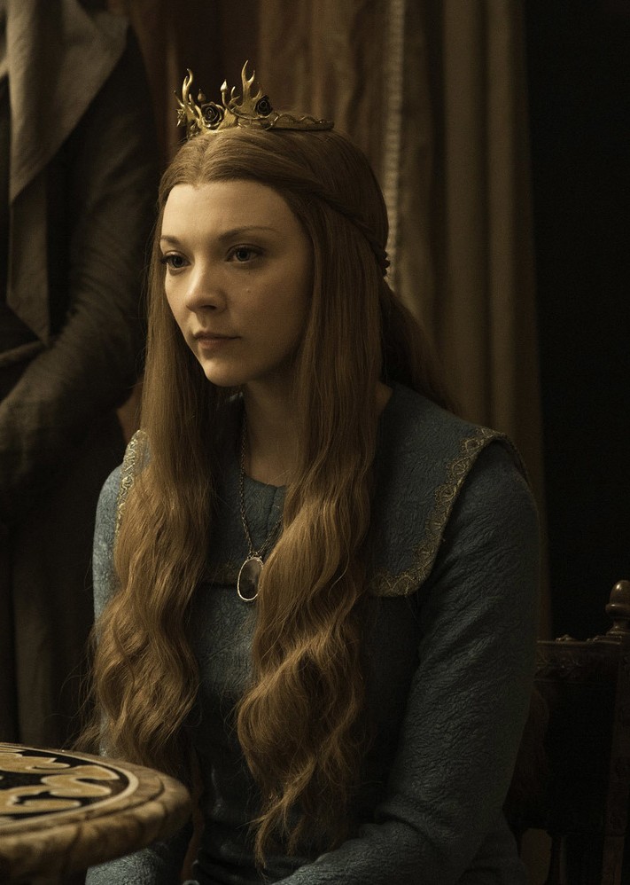 By Season 3, Cersei is leaning into the Lannister imagery hard. She is regularly seen in extravagant red and gold dresses, and we start to see this wide neckline that creates a much more imposing silhouette than we’ve seen from her so far. In addition to the dress being Lannister red, we can also see the lion motif (House Lannister’s sigil) displayed prominently. In case the lion embroidered on her shoulder wasn’t clear enough, Cersei wears a massive gold lion necklace. Feeling insecure as the Tyrells assert their dominance, she’s power dressing in a last-ditch attempt to remind people that the Lannisters are still the richest family in Westeros.