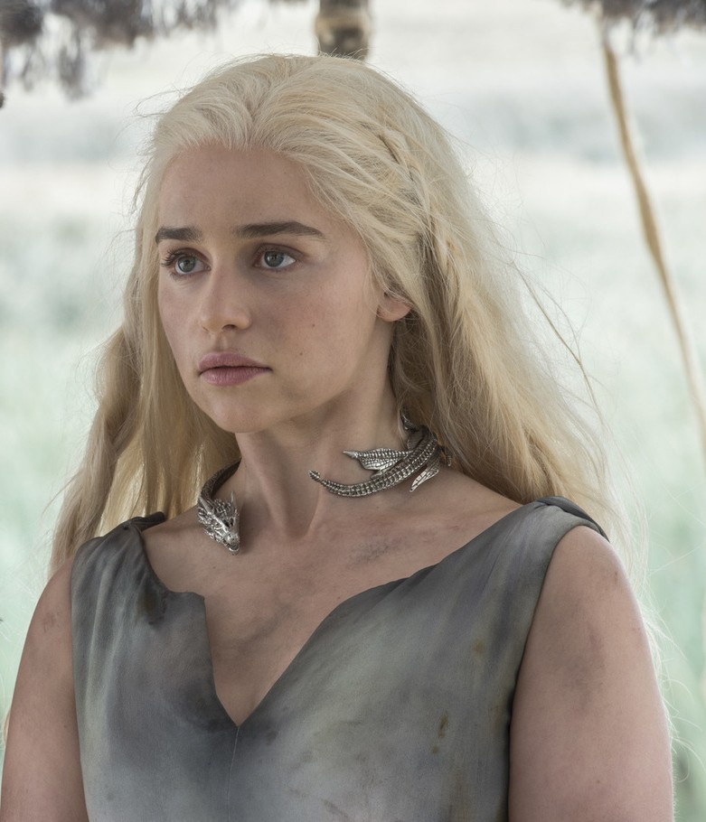 When we first see this necklace in Season 5, it’s a much more impressive statement piece. Here, it just looks kind of sad. I see this as an intentional choice, showing the audience visually how far Daenerys has fallen now that she’s a prisoner of the Dothraki. It also reminds us that she doesn’t have her dragons to protect her anymore. Rhaegal and Viserion are locked away in Meereen and Drogon has gone off to who knows where, so Daenerys’ dragon jewelry is just a hollow symbol of a power she no longer has.