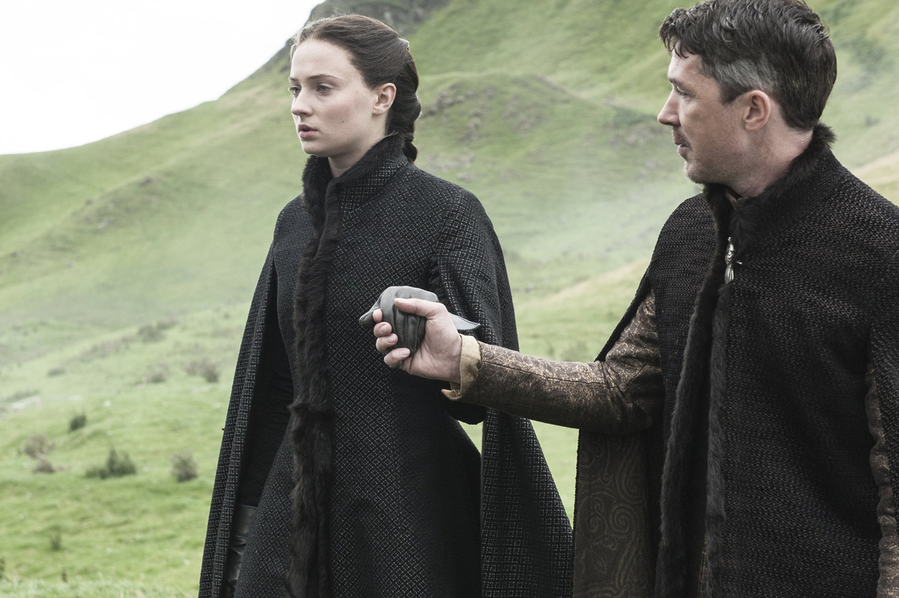 After Littlefinger kills Lysa, we see a new side of Sansa emerge. She’s always tried to visually emulate whoever she’s most influenced by, and now that’s Littlefinger. In addition to dying her hair black to disguise her identity, she starts wearing this fur-trimmed coat that’s almost identical to Littlefinger’s. It’s also the first time in a long time we’ve seen Sansa wear fur, a hint that she’s on her way to returning to her roots in the North.