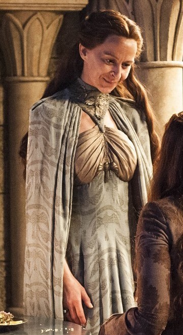 Yes, Lysa is the worst, but I like her dress. Sue me. When we meet her in Season 1, she’s wearing a very stuffy dress with a high neck and her hair pulled back. When we see her again in Season 4, her style is much more open. The halter-style neckline and half-up/half-down hairstyle make her look far less stern, helping us understand why Sansa trusts her at first. She’s also wearing a slightly more revealing outfit because, now that Littlefinger is within reach, she wants to seduce him. For their actual wedding ceremony, she tosses the cape-like sleeves over her shoulders to show more of her arms, making the outfit look less regal and more carefree. You can also see that the fabric is emblazoned with the moon and falcon sigil of House Arryn.