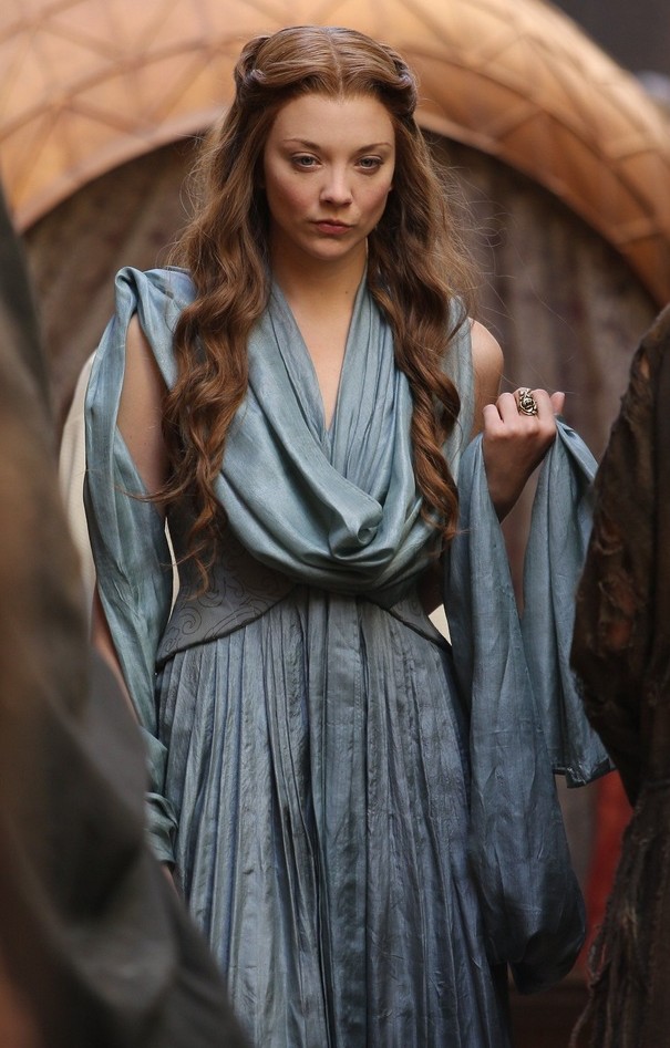 This dress is interesting to me because it’s unlike anything else we ever see Margaery wear. I love the draping and the shawl, but it seems at face value like a very un-Margaery-like outfit. However, this dress actually serves a need for the plot. In this scene, Margaery goes out into the city to visit an orphanage. There’s a brief moment where we see her walk over a pile of *ahem* human waste on the ground (we are in medieval times, after all), and when her handmaiden warns her to be careful of her dress, she smiles and shrugs it off. Margaery is putting on a show for Joffrey and the people of Flea Bottom by doing this, and her lack of concern for her dress is part of that show. If she wasn’t wearing a long shawl, it wouldn’t drag in the dirt, and we would lose an important moment for her character.