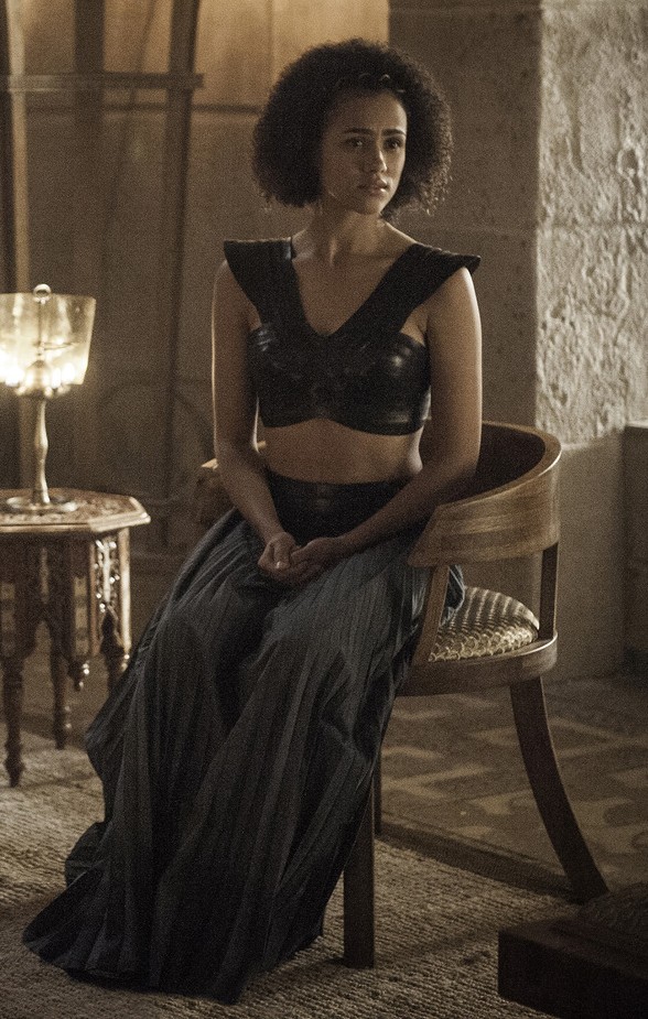 With Daenerys missing in action, we finally get to see Missandei in an outfit that could be representative of her personal style. It’s a tougher version of the outfit she wears in the fighting pit, with a leather harness-like top and *gasp* pants. This is easily my favorite outfit of Missandei’s, and I would happily wear it myself.