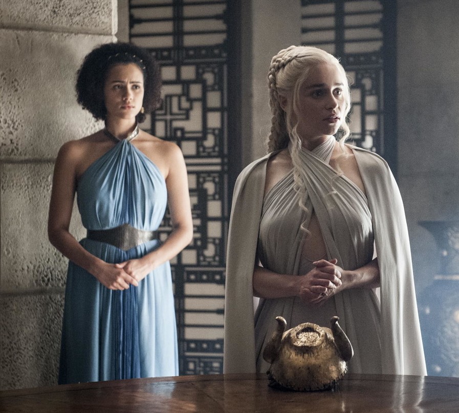 The thing that strikes me about this dress is just how much influence Missandei takes from Daenerys. We can see here that Missandei and Daenerys are wearing similar dress styles, and closer inspection reveals still more similarities. When Missandei first joins Daenerys, she adopts a matching blue and white color palette. It also apears that Missandei’s belt and neckpiece are borrowed from Daenerys, who wore them with similar dresses in Seasons 3 and 4.
