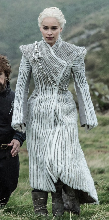 One of my all-time favorite looks from the series is this white coat Daenerys wears for her trip north of the wall. Clapton said this coat was made almost entirely using fake fur, and it looks so soft and cozy that I wish I could wear it. See one of her sketches here. This coat serves the obvious purpose of keeping Daenerys warm in the North, but it also helps her to project a certain image of herself. When she arrives at the frozen lake where Jon and the others are trapped, she’s like a guardian angel dressed all in white, descending to bring their salvation from certain doom at the hands of the white walkers. And it seems to do the job, since Jon ends up bending the knee to Daenerys afterwards.