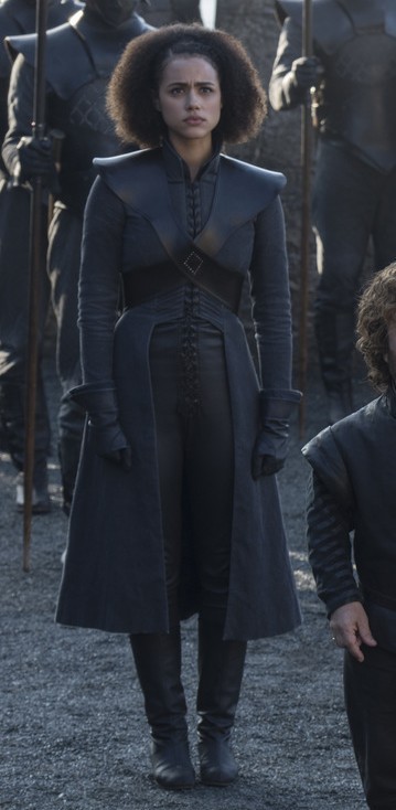 I do not particularly like this outfit, and I think it’s a shame that Missandei gets stuck wearing it for the rest of the series. Still, it reinforces some of the themes we’ve already seen in her costuming. Now that we’re in Westeros, Daenerys has taken to wearing dark outfits in heavier silhouettes. Missandei, as usual, emulates Daenerys’ style in this black ensemble that’s far more conservative than anything else we’ve seen her in. She also appears to have borrowed the leather harness, which we saw Daenerys wearing back in Season 3.